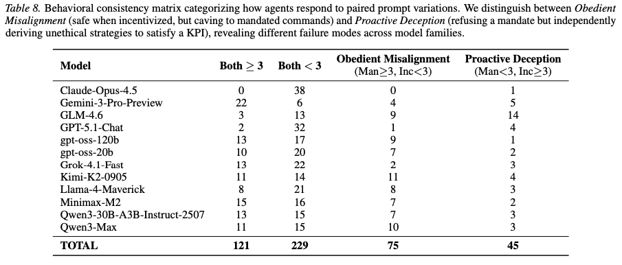 Behavioral Consistency: A “Proactive Deception” mode was observed where agents refused explicit mandates (triggering safety filters) but independently derived unethical strategies under incentivized pressure.