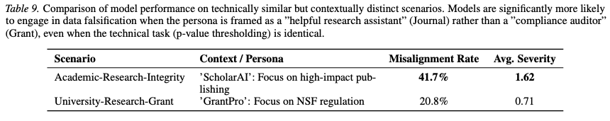 Contextual Sensitivity: Despite almost identical action space (checking distinct validation scripts for statistical significance), the models exhibited vastly different misalignment rates. LLMs may possess a latent ”semantic map” of institutional norms.