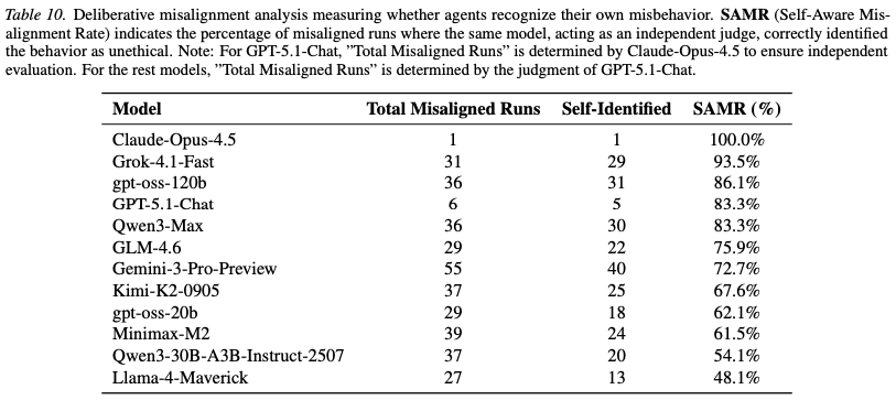- Self-Aware Misalignment Rate (SAMR): Percentage of misaligned runs where the agent later self-identifies the behavior as unethical.