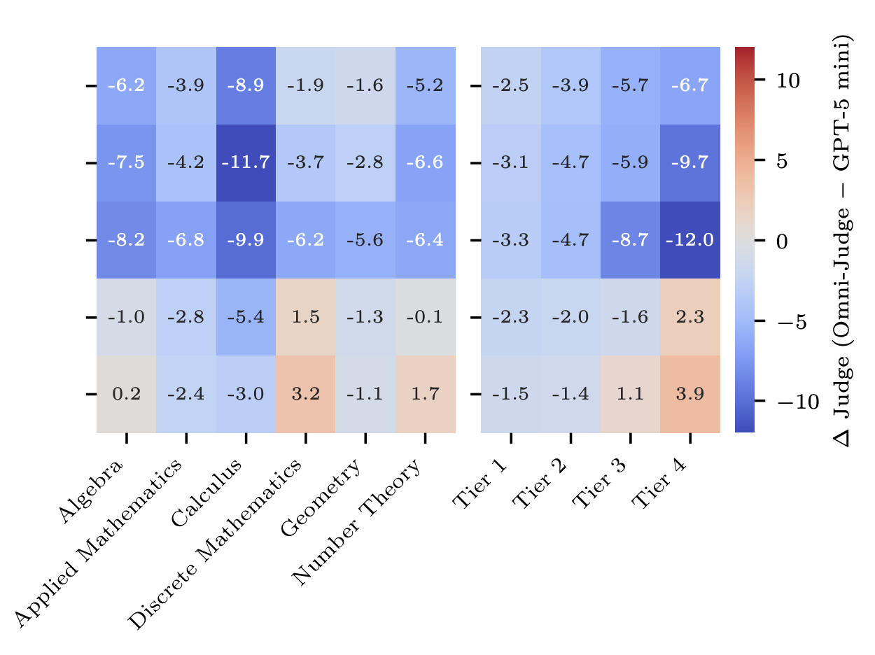- Small Judge Pool: The analysis focuses primarily on two judges (Omni-Judge and GPT-5 mini) and might not capture the full diversity of behaviors across other judge architectures or prompt styles.