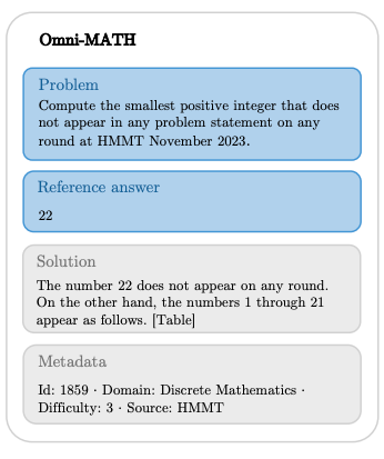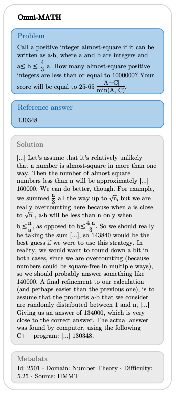- Risk of Data Leakage: The study identifies a potential risk of data leakage within the original Omni-MATH dataset. In one instance, the model correctly answered a problem about a specific 2023 competition that would be impossible to solve without prior access to the question sheet, suggesting that models may be relying on memorized training data rather than true reasoning for certain items.