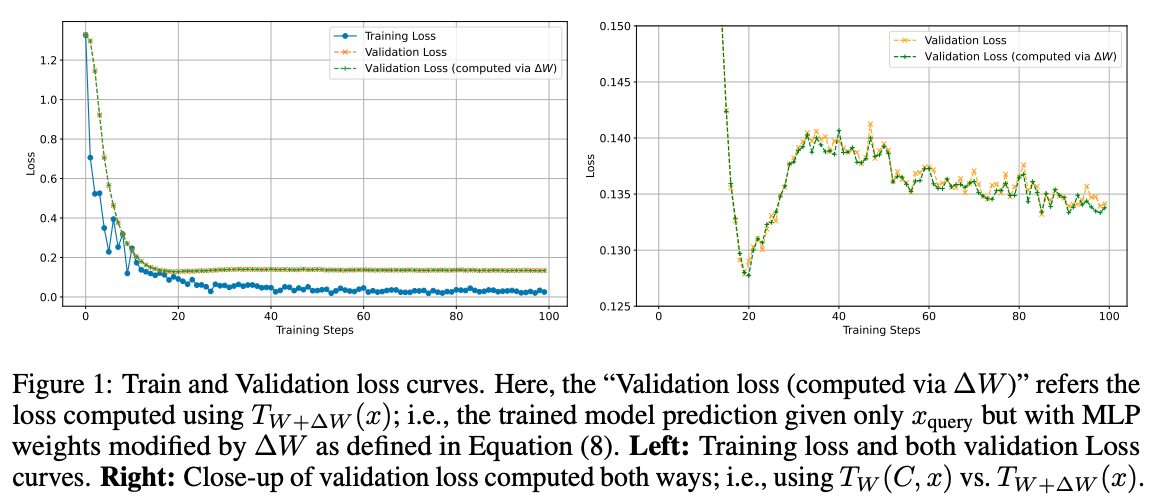 - Verification of Theorem 2.2 (Figure 1): The experiment successfully validates the main theorem. The validation loss computed using the standard in-context prompt () and the loss computed using the implicit weight update () are in “remarkable agreement”. Figure 1 (left and right) plots both validation loss curves over training steps, showing they are visually indistinguishable.