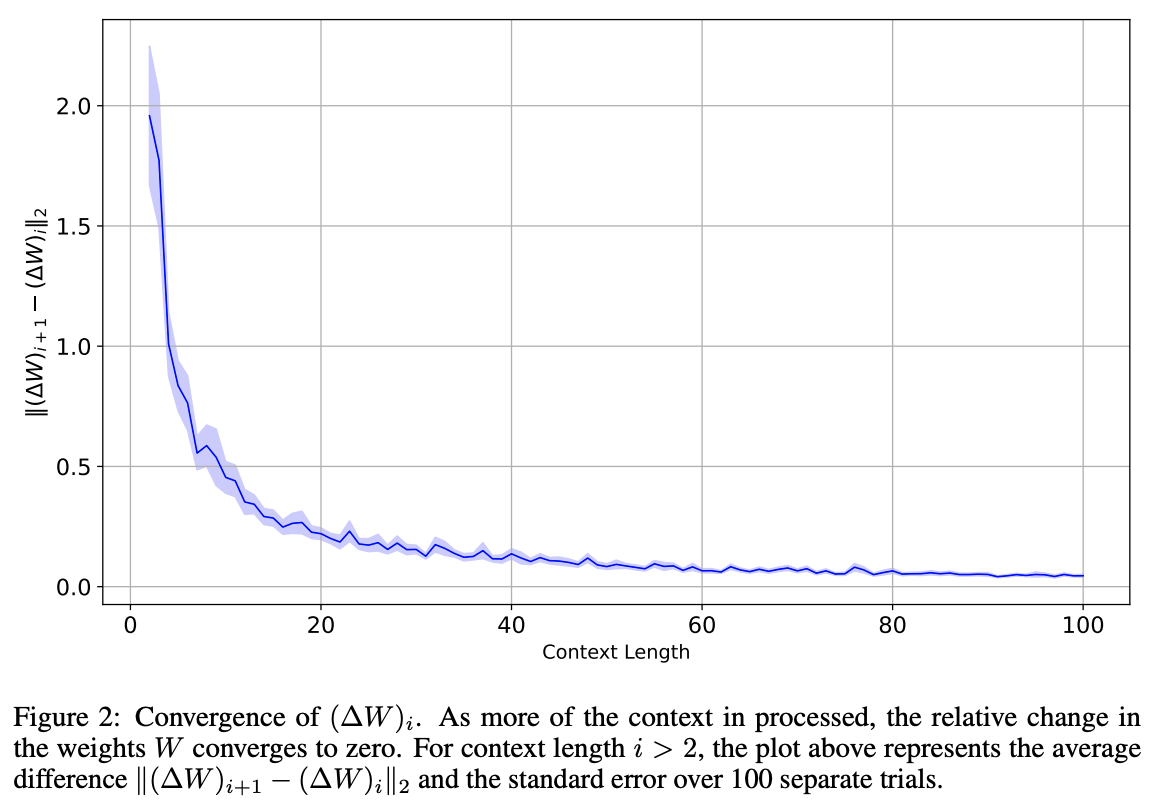- Convergence of Implicit Dynamics (Figure 2): The implicit learning dynamics converge as predicted. Figure 2 plots the L2-norm of the marginal change in the weight update () against the context length. This value, representing the gradient update, rapidly decreases and “vanishes” as more context tokens are processed, mimicking a converging gradient descent process.