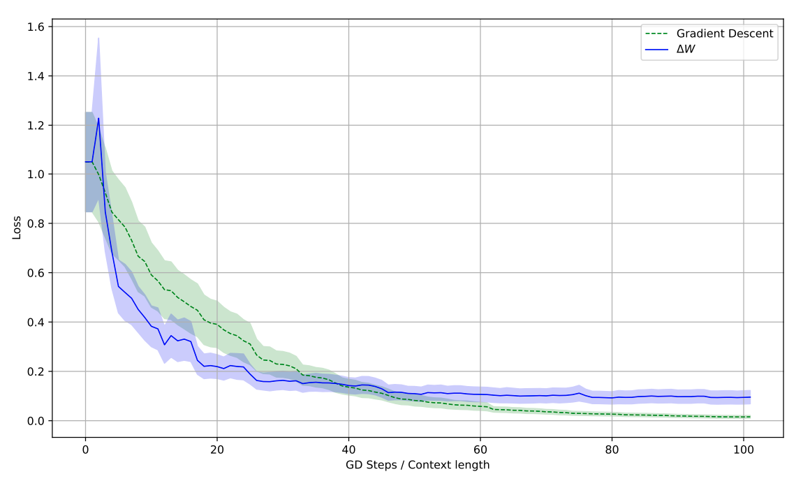 - Comparison with Finetuning (Figure 3): The implicit weight transfer and explicit finetuning via gradient descent (GD) show similar, though not identical, behaviors. Figure 3 plots the test loss for both methods against the number of examples (context length for , GD steps for finetuning). Both curves show the loss decreasing as more examples are processed, with the authors noting that the two processes “minimize the loss in similar ways”.